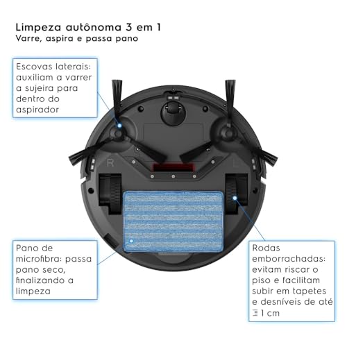 - Funções 3 em 1: Varre, aspira e passa pano (função MOP) para uma limpeza completa e eficiente.